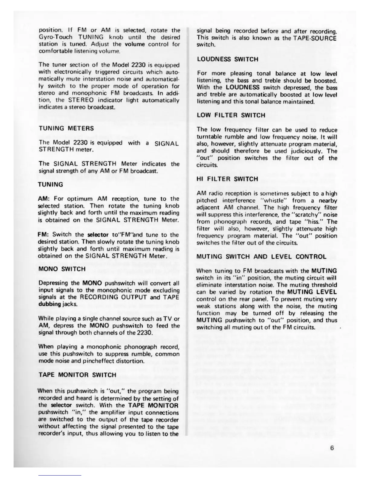 Marantz 2230 - Controls and Features; Tuning and Signal Strength Meter; Mono Switch Operation; Tape Monitor Function