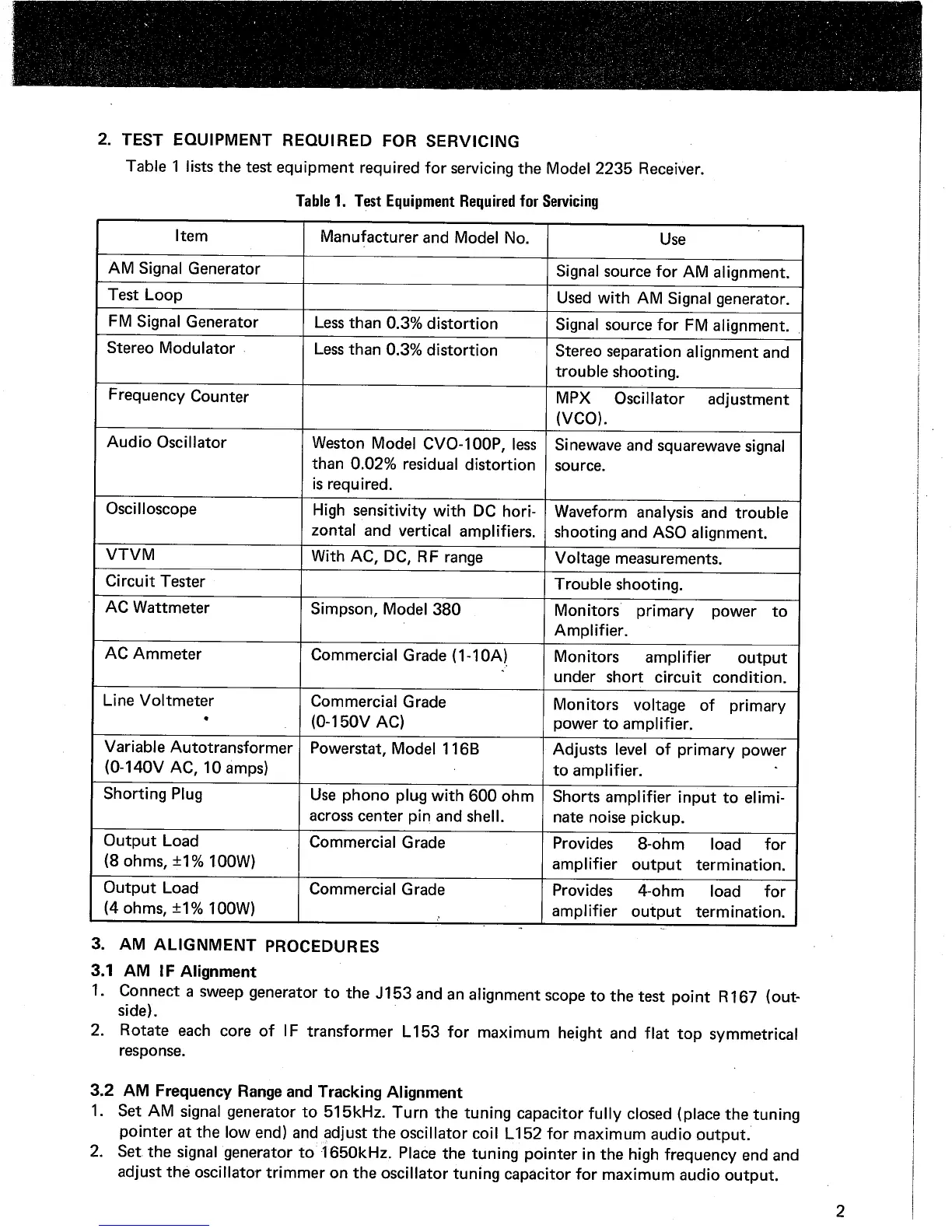 Marantz 2235 - Test Equipment Required for Servicing; AM Alignment Procedures; AM IF Alignment Steps; AM Frequency Range and Tracking Alignment