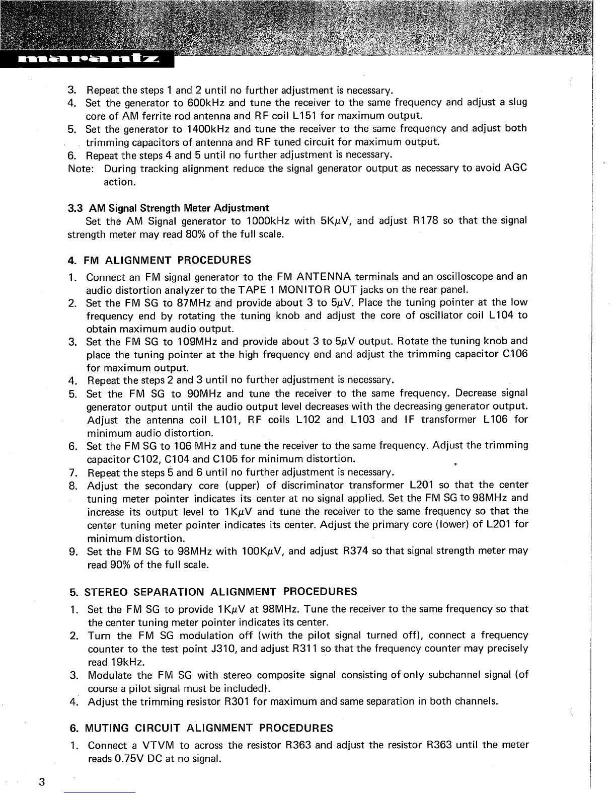 Marantz 2235 - AM Signal Strength Meter Adjustment; FM Alignment Procedures; FM Alignment Steps (87 MHz-109 MHz); FM Alignment Steps (90 MHz-106 MHz)