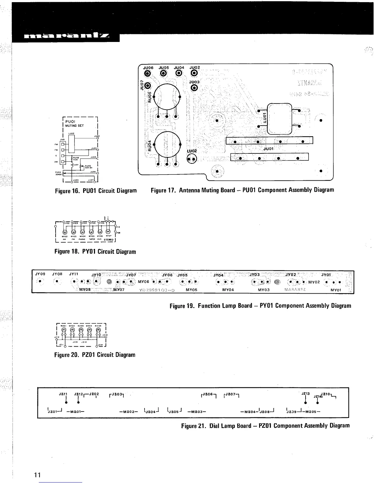Marantz 2235B - PU01 Circuit Diagram; Antenna Muting Board - PU01 Component Assembly Diagram; PY01 Circuit Diagram; Function Lamp Board - PY01 Component Assembly Diagram