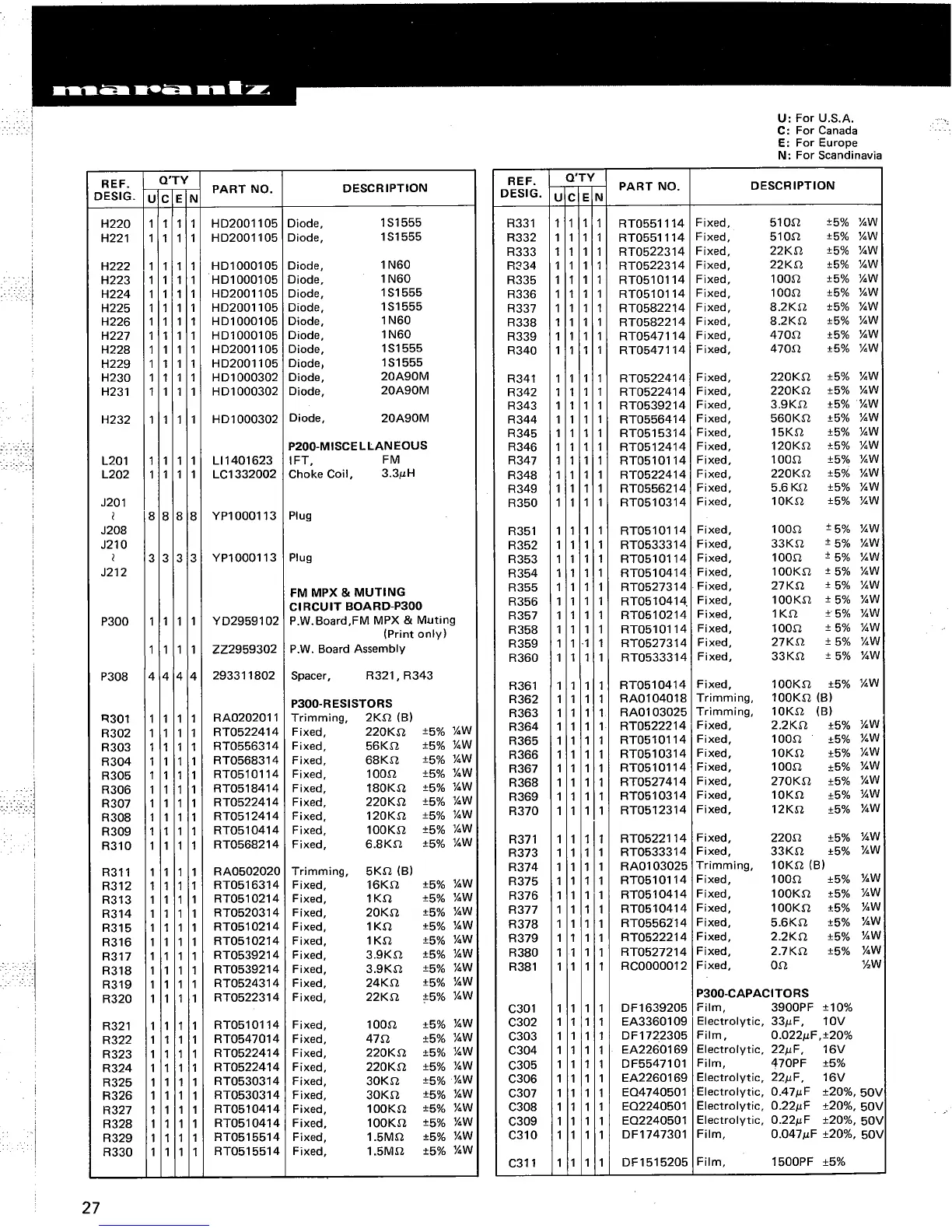 Marantz 2235B - P200-Miscellaneous; FM MPX & Muting Circuit Board-P300; P300-Resistors; P300-Capacitors
