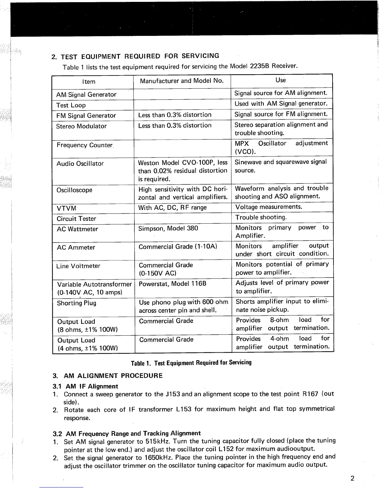 Marantz 2235B - Test Equipment Required for Servicing; AM Alignment Procedure; AM if Alignment; AM Frequency Range and Tracking Alignment