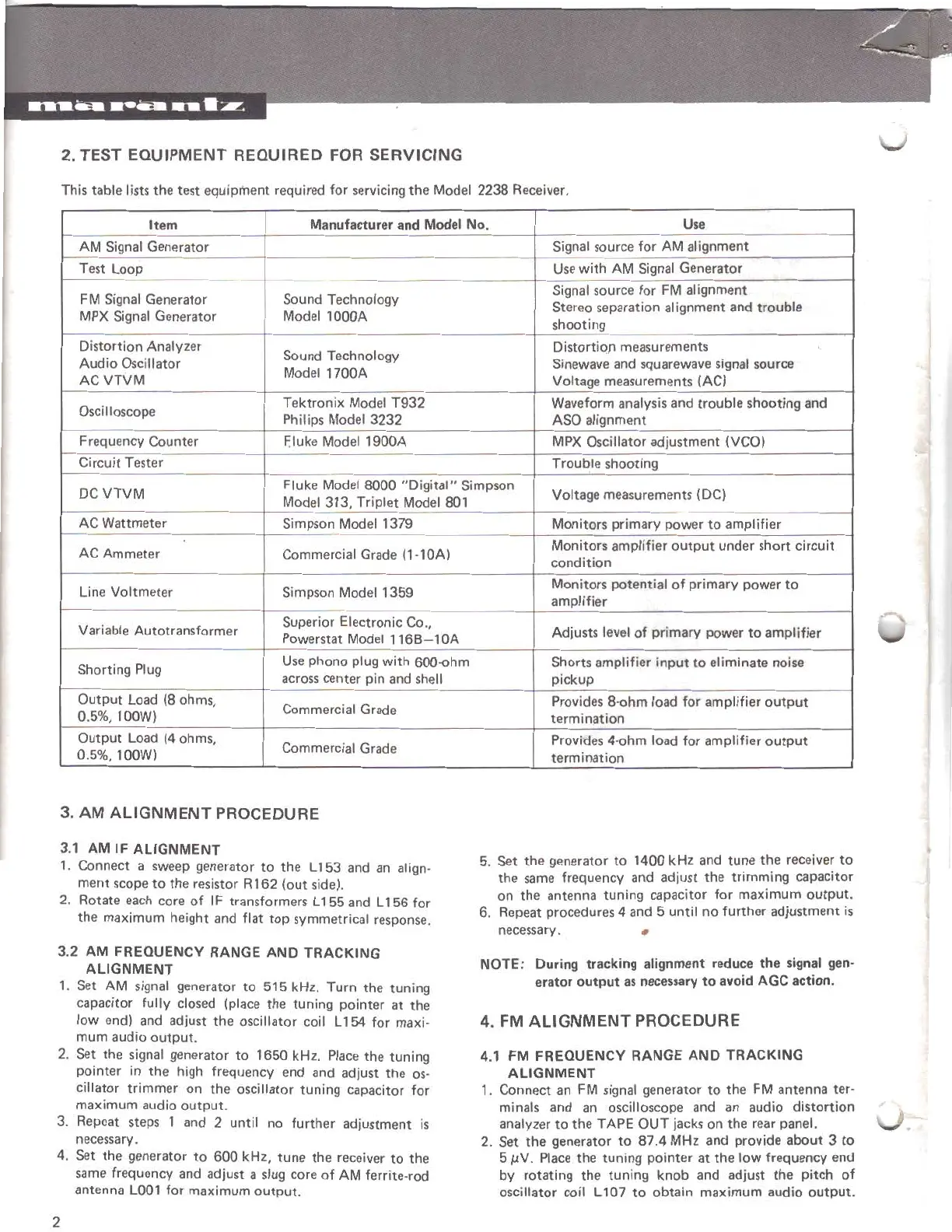 Marantz 2238 - Test Equipment Required for Servicing; AM Alignment Procedures; AM IF Alignment; AM Frequency Range and Tracking Alignment