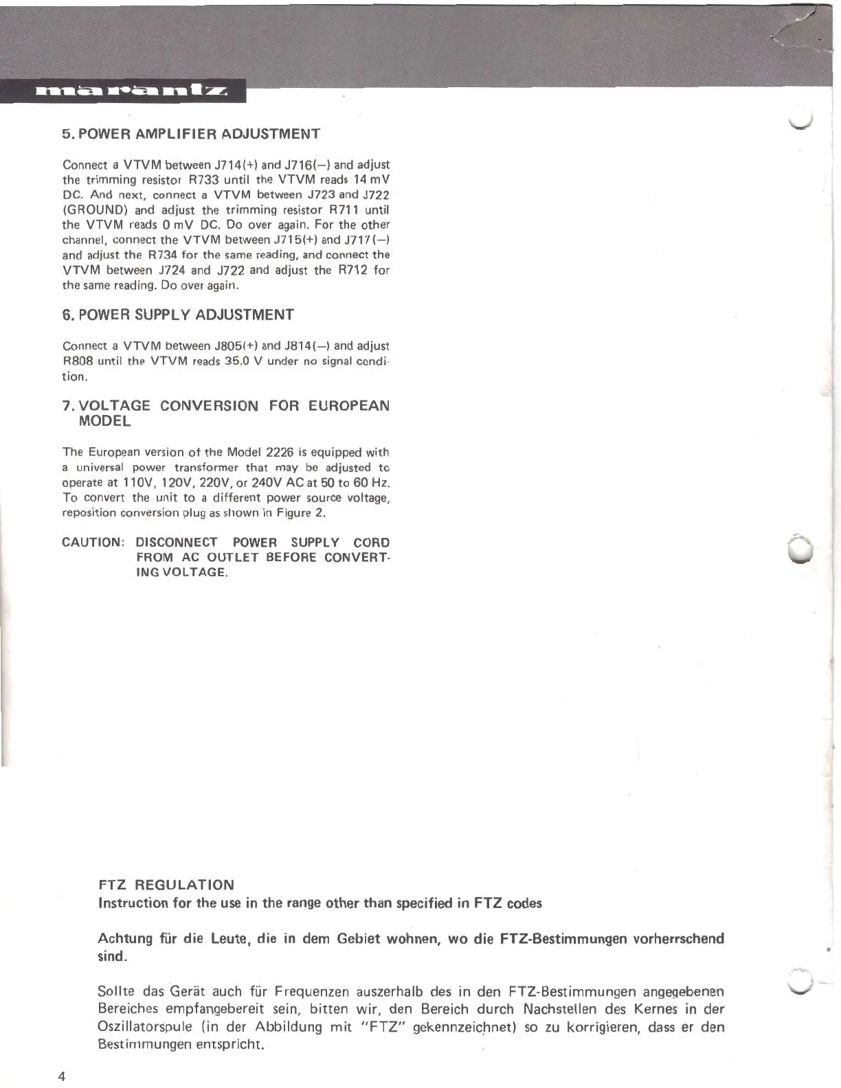 Marantz 2238 - Power and Voltage Adjustments; Power Amplifier Adjustment; Power Supply Adjustment; Voltage Conversion for European Model