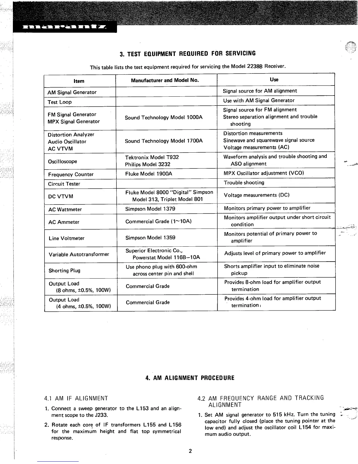 Marantz 2238B - Test Equipment Required for Servicing; Required Test Equipment List; AM Alignment Procedure; AM IF Alignment