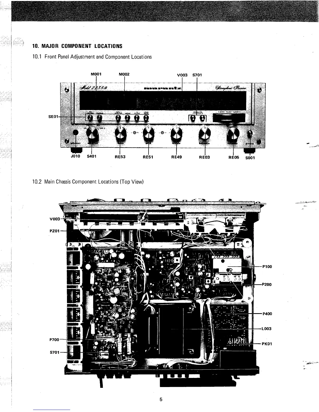 Marantz 2238B - Major Component Locations; Front Panel Component Locations; Main Chassis Component Locations (Top View)