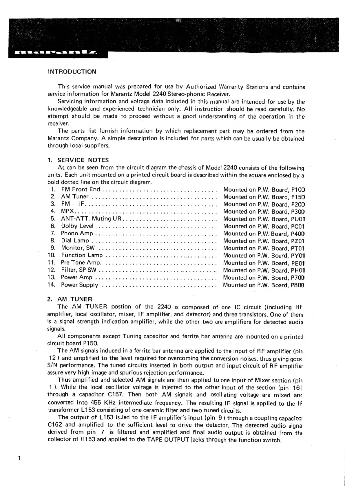 Marantz 2240 - Introduction; Service Notes; FM Front End Unit; AM Tuner Unit