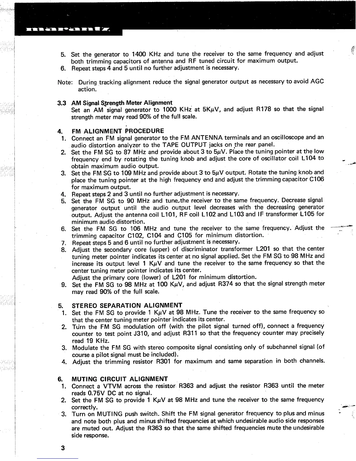 Marantz 2250 - FM Alignment Procedures; Stereo Separation Alignment; Muting Circuit Alignment