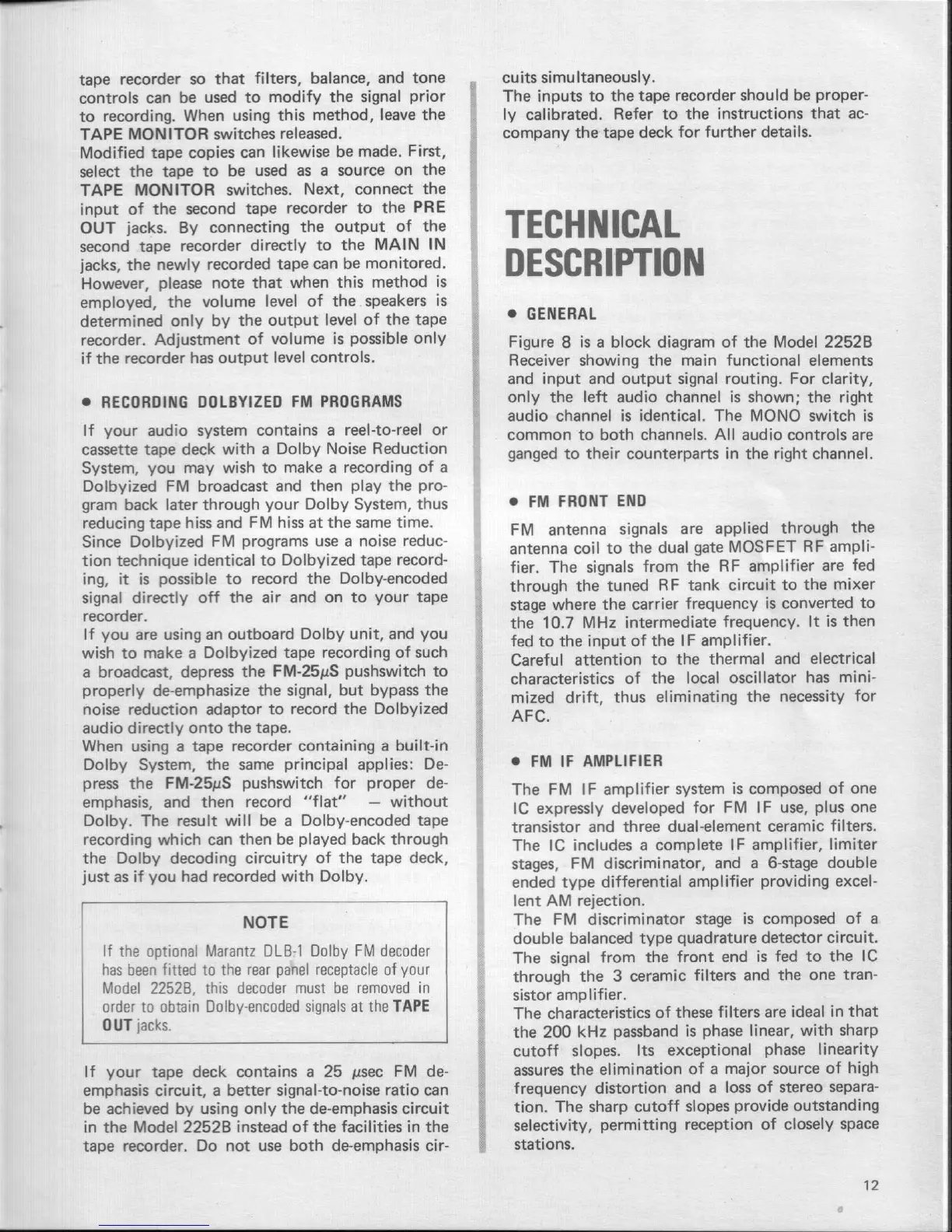 Marantz 2252B - Technical Description; General System Overview; FM Front End; FM IF Amplifier