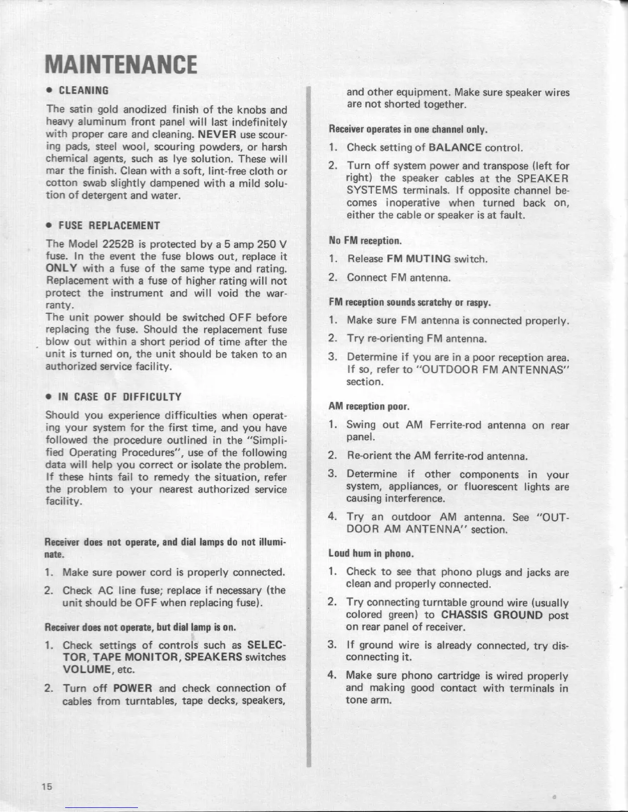 Marantz 2252B - Maintenance; Cleaning Instructions; Fuse Replacement; Troubleshooting Difficulties