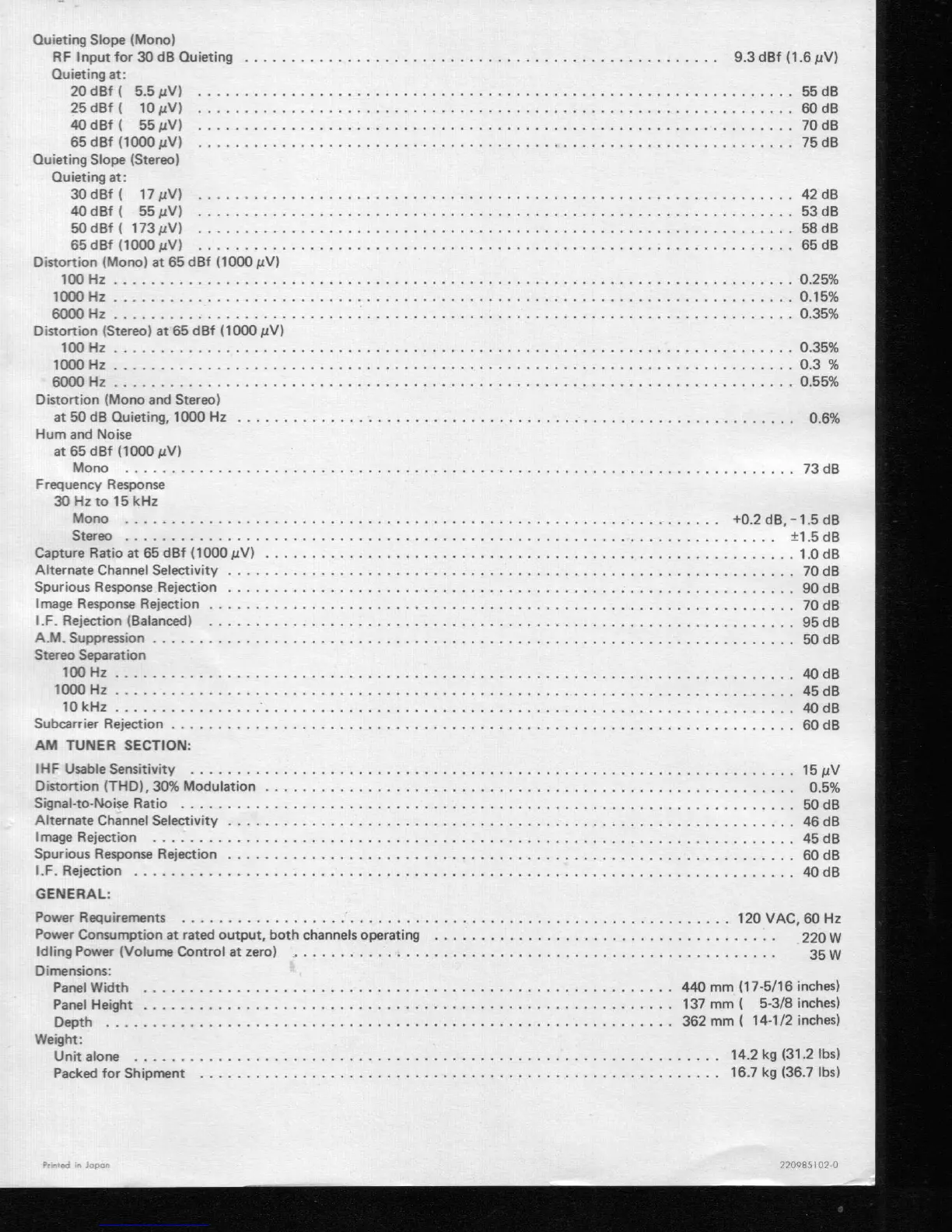 Marantz 2252B - AM Tuner Section Specifications; General Specifications