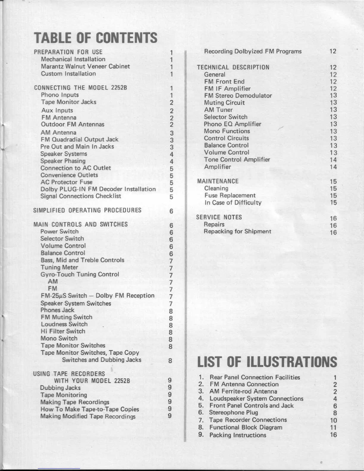 Marantz 2252B - Table of Contents; List of Illustrations