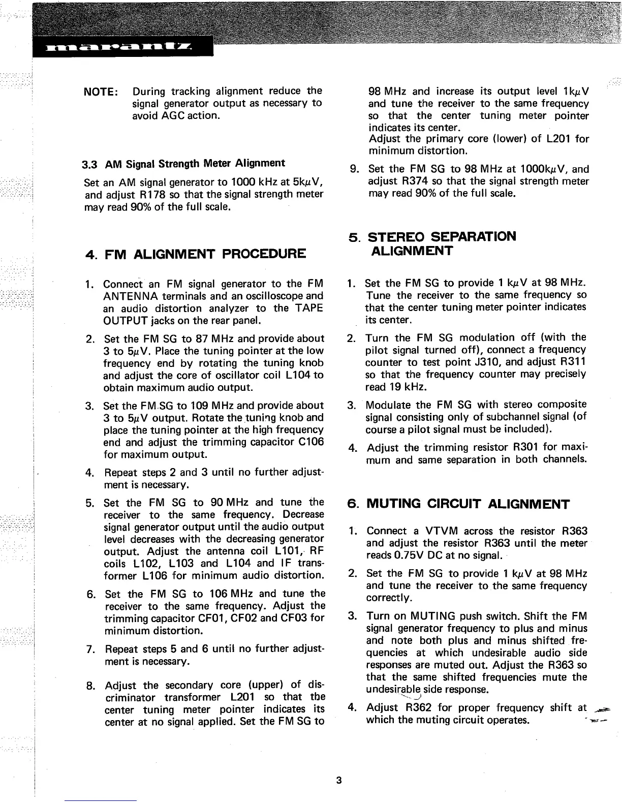 Marantz 2265 - AM Signal Strength Meter Alignment; FM Alignment Procedures; FM Alignment Procedure Steps