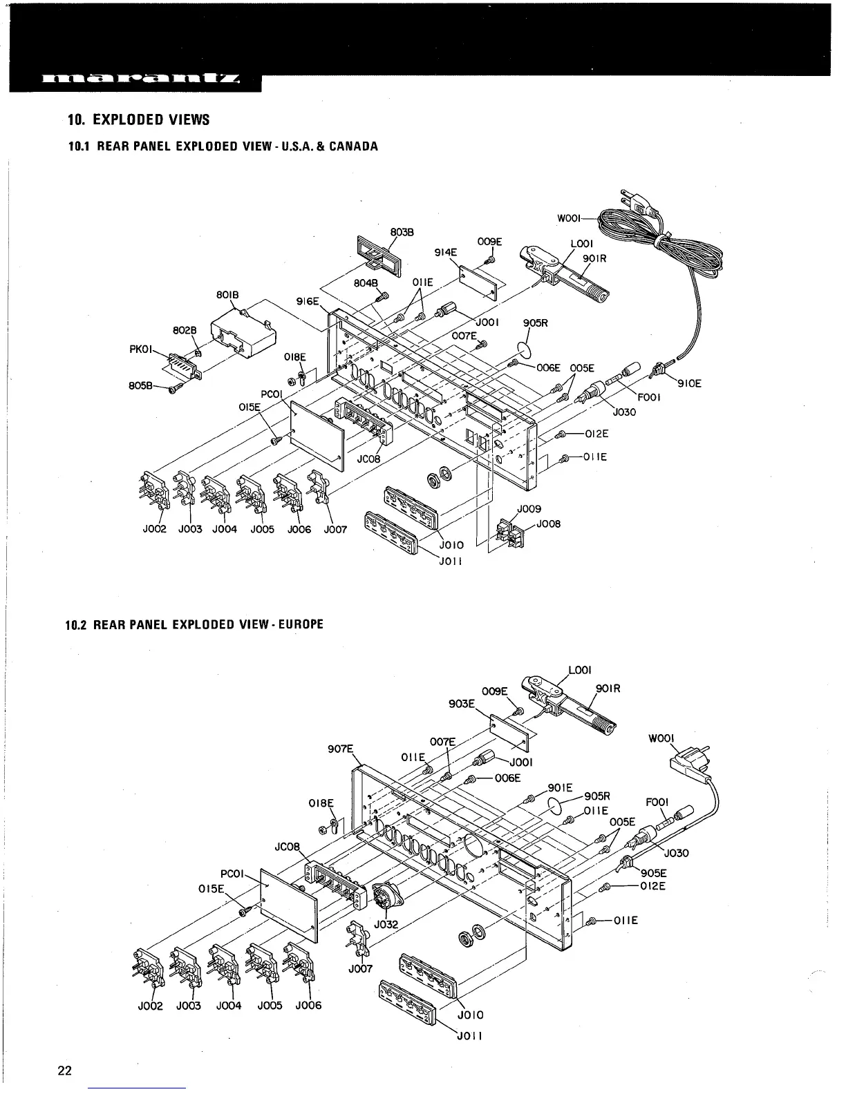 Marantz 2265B - Exploded Views; Rear Panel Exploded View - USA & Canada; Rear Panel Exploded View - Europe