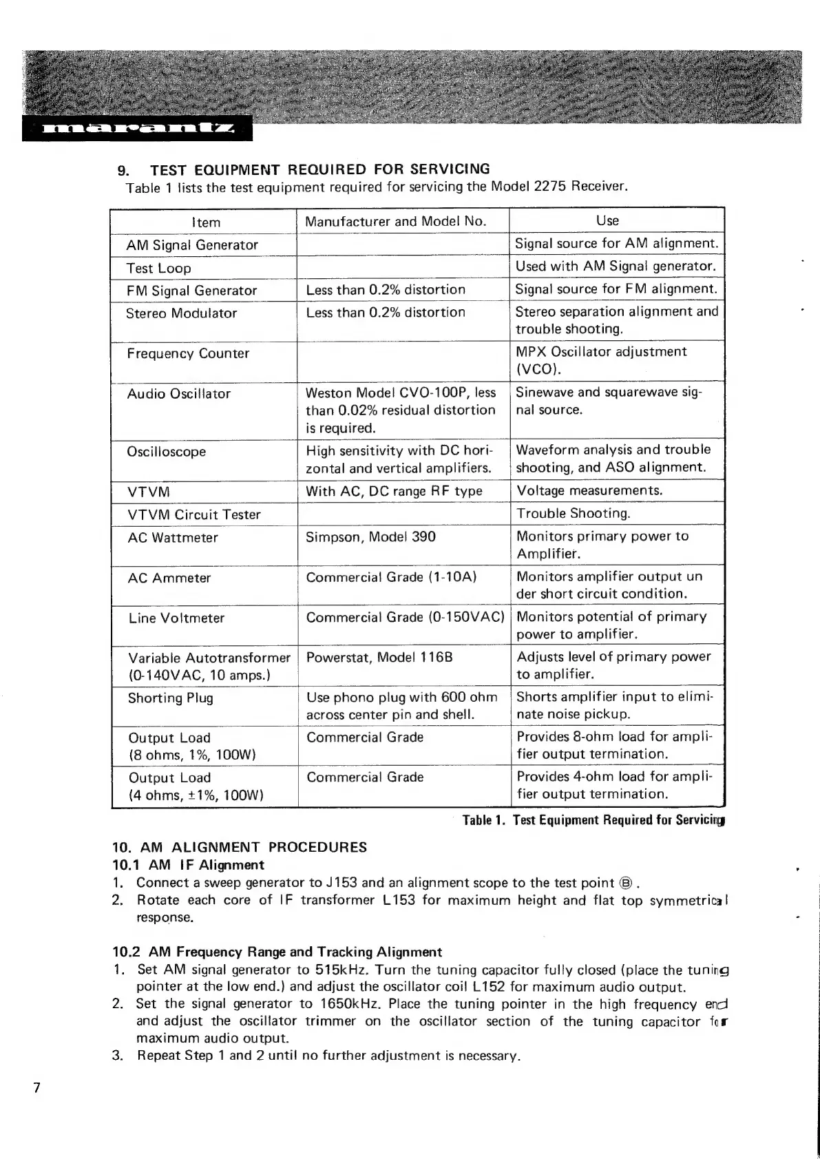 Marantz 2275 - SERVICING PROCEDURES AND TEST EQUIPMENT; Test Equipment Requirements; AM Alignment Procedures