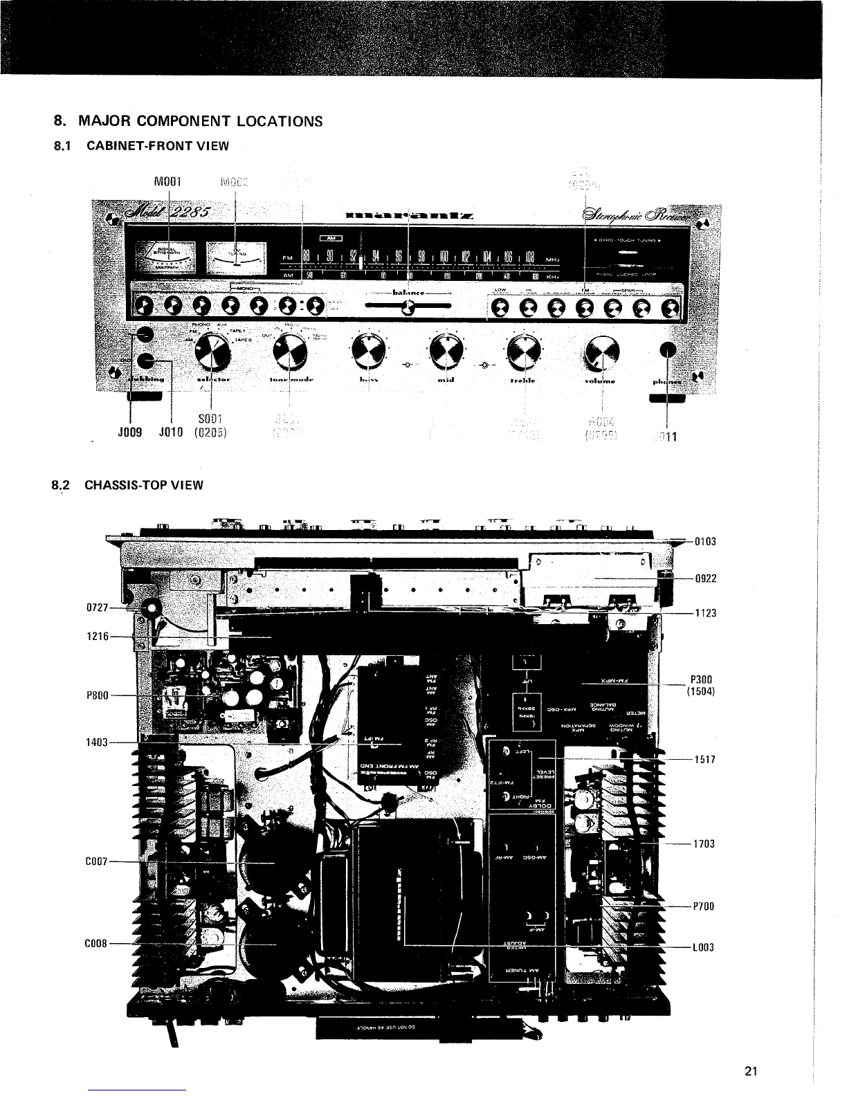 Marantz 2285 - Major Component Locations; Cabinet-Front View; Chassis-Top View
