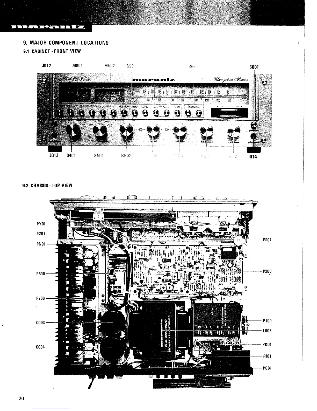 Marantz 2285B - Major Component Locations; Cabinet - Front View; Chassis - Top View