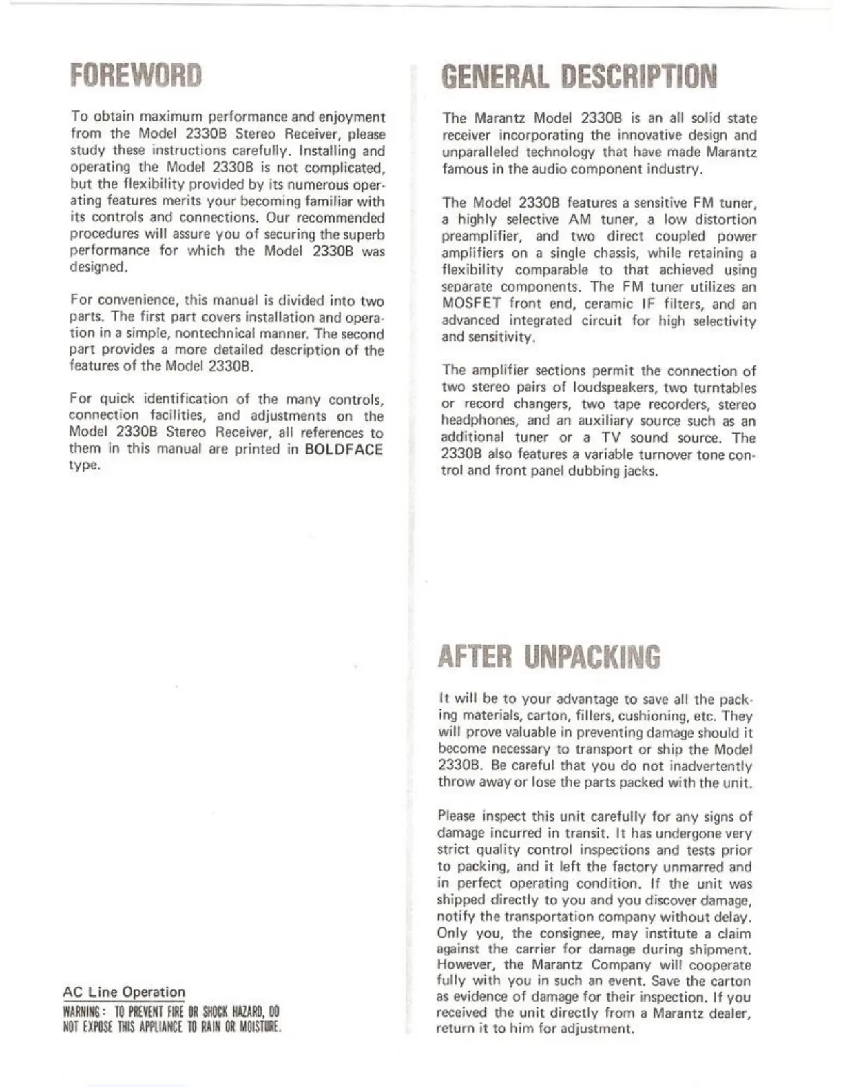 Marantz 2330B - FOREWORD; GENERAL DESCRIPTION; AFTER UNPACKING