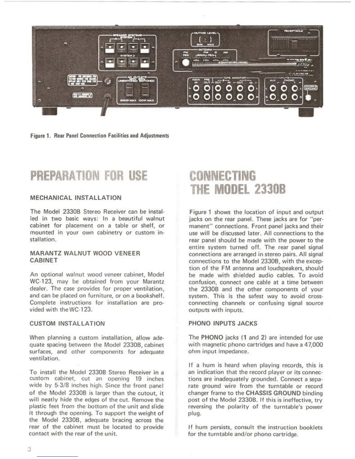 Marantz 2330B - PREPARATION FOR USE; MECHANICAL INSTALLATION; MARANTZ WALNUT WOOD VENEER CABINET; CUSTOM INSTALLATION