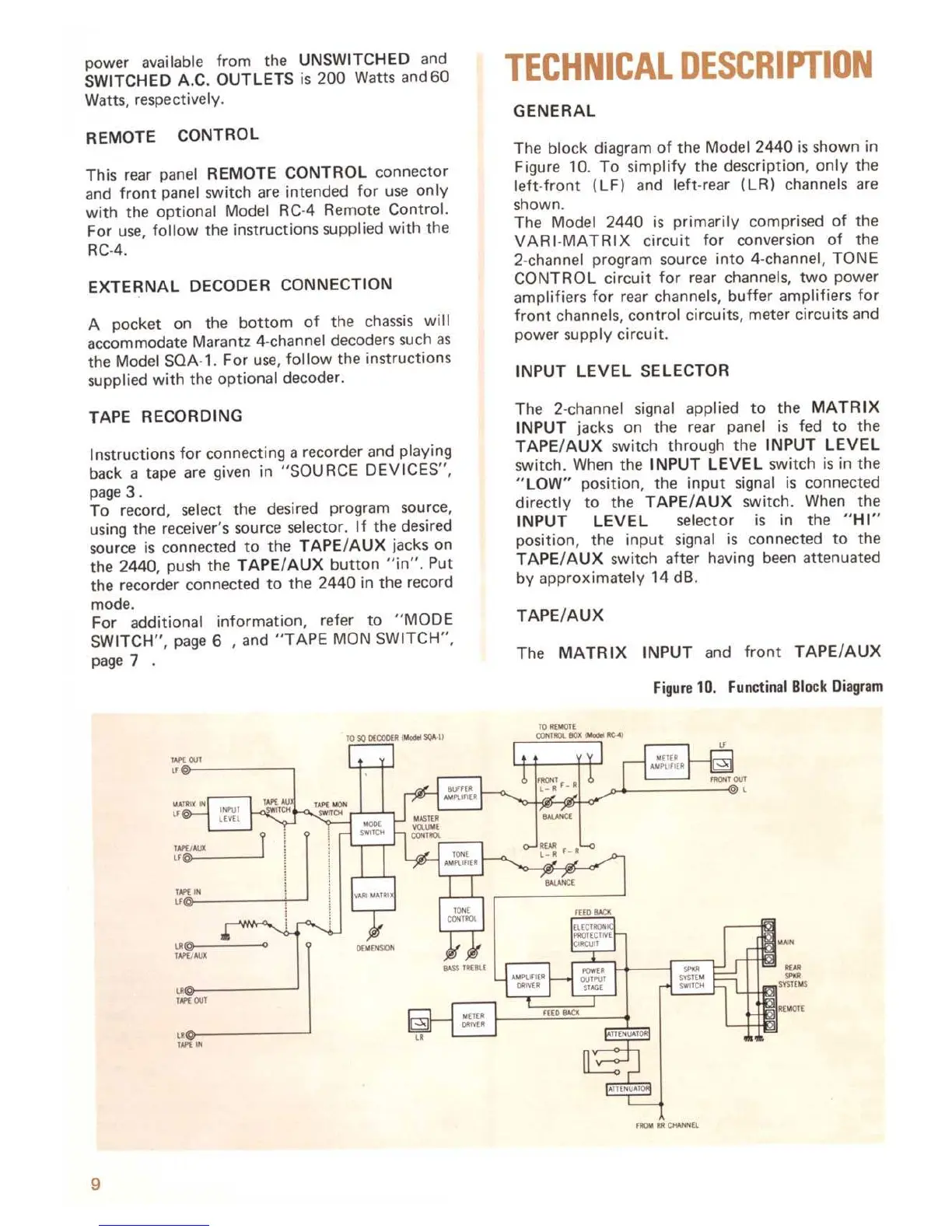 Marantz 2440 - Remote Control Operation; External Decoder Connections; Tape Recording Instructions