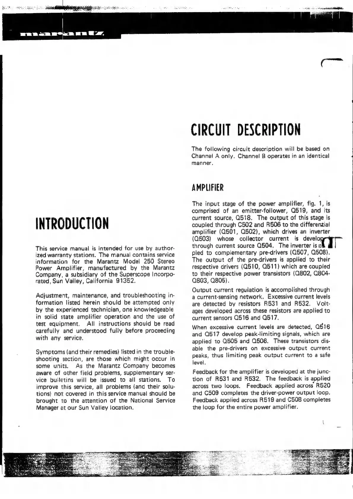 Marantz 250 - Introduction to the Service Manual; Circuit Description Overview; Amplifier Circuit Details