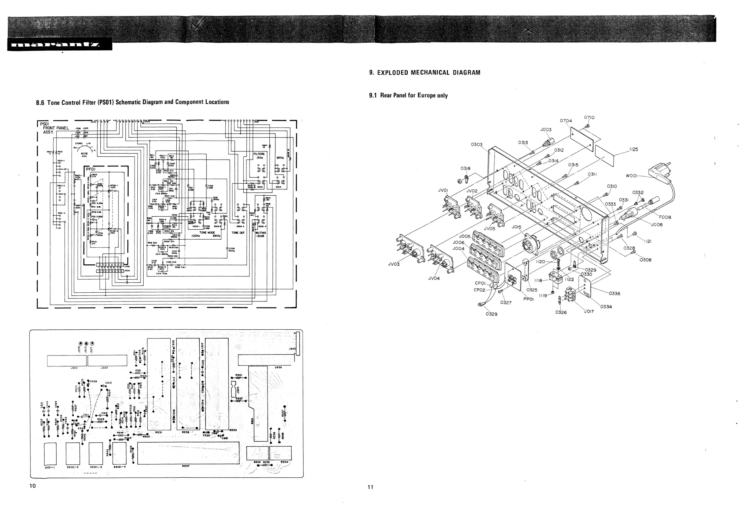 Marantz 3250B - Tone Control Filter (PS01) Diagram; Exploded Mechanical Diagram; Rear Panel Diagram (Europe Only)