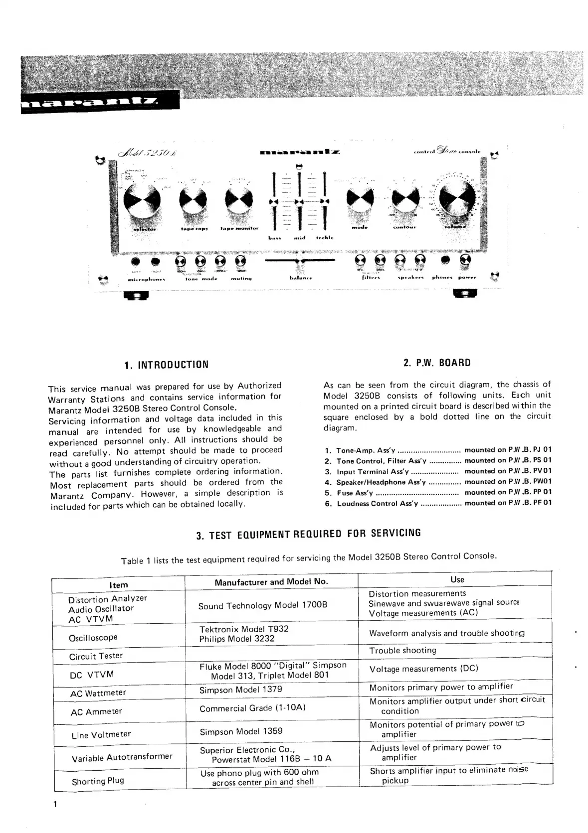Marantz 3250B - Introduction to Service Manual; P.W. Board Component Units; Required Servicing Test Equipment