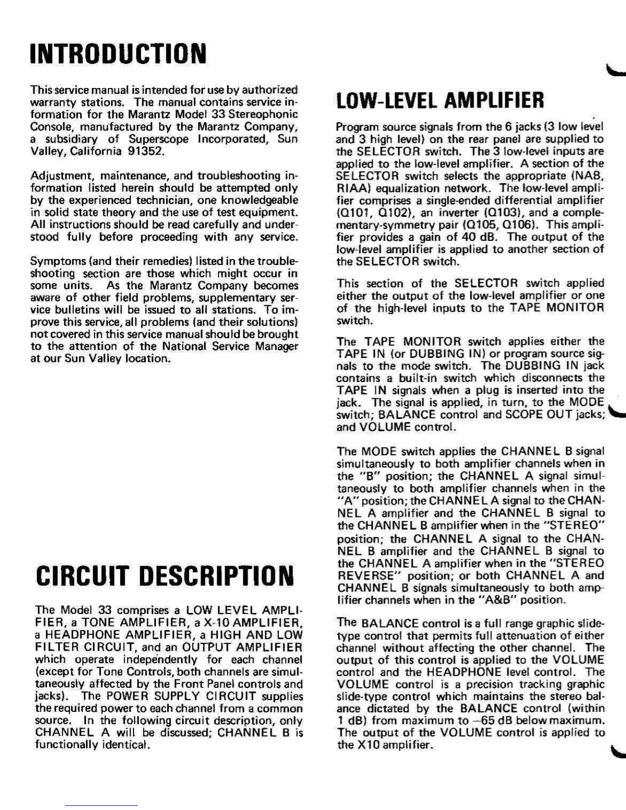 Marantz 33 - Introduction; Low-Level Amplifier; Circuit Description; Tone Amplifier