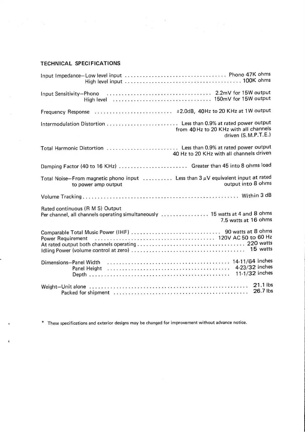 Marantz 4070 - Technical Specifications; Input and Sensitivity Specifications; Performance Metrics Specifications; Power Output and Requirements
