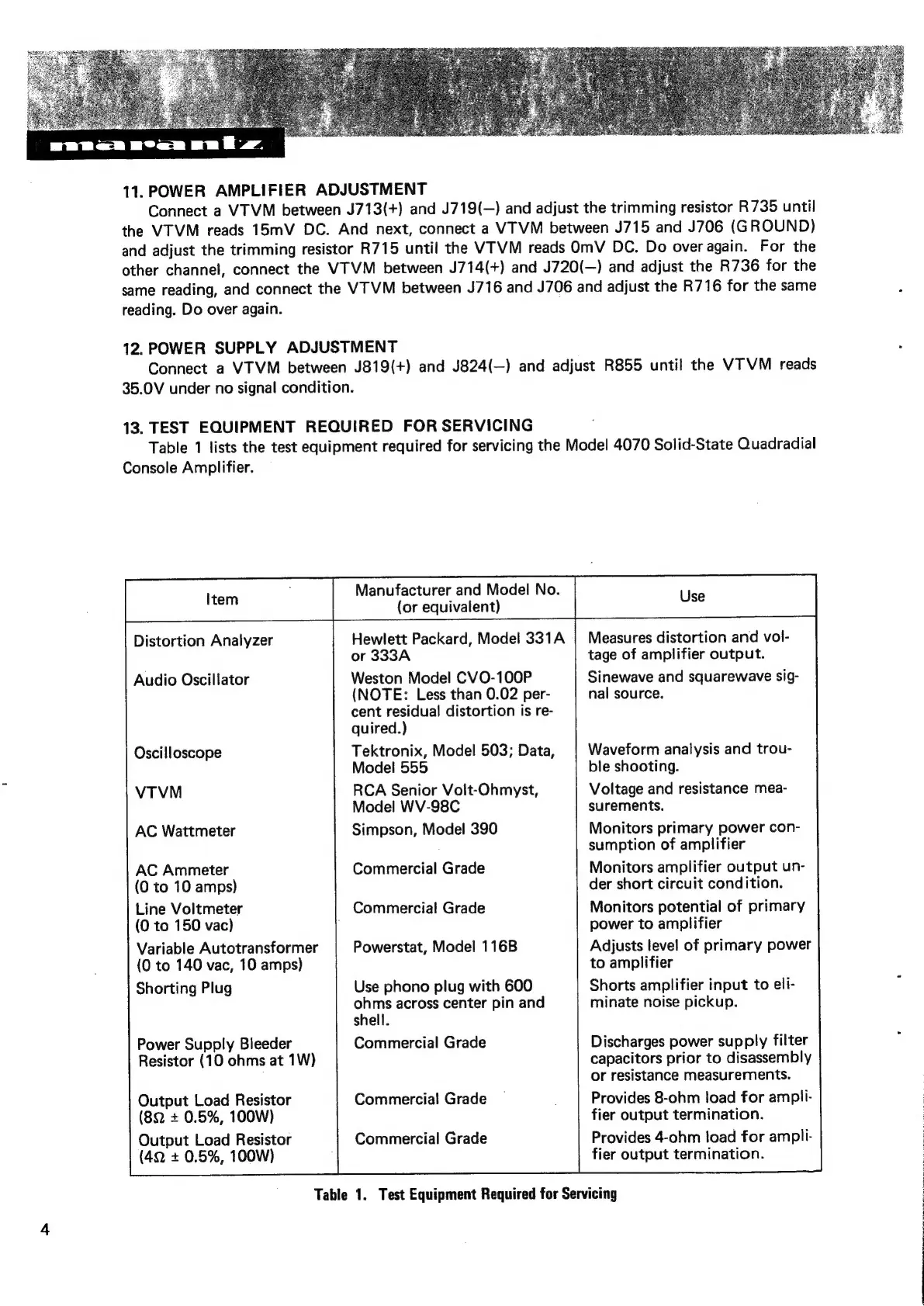 Marantz 4070 - Service Adjustments and Equipment; Power Amplifier Adjustment Procedures; Power Supply Voltage Adjustment; Required Servicing Equipment List