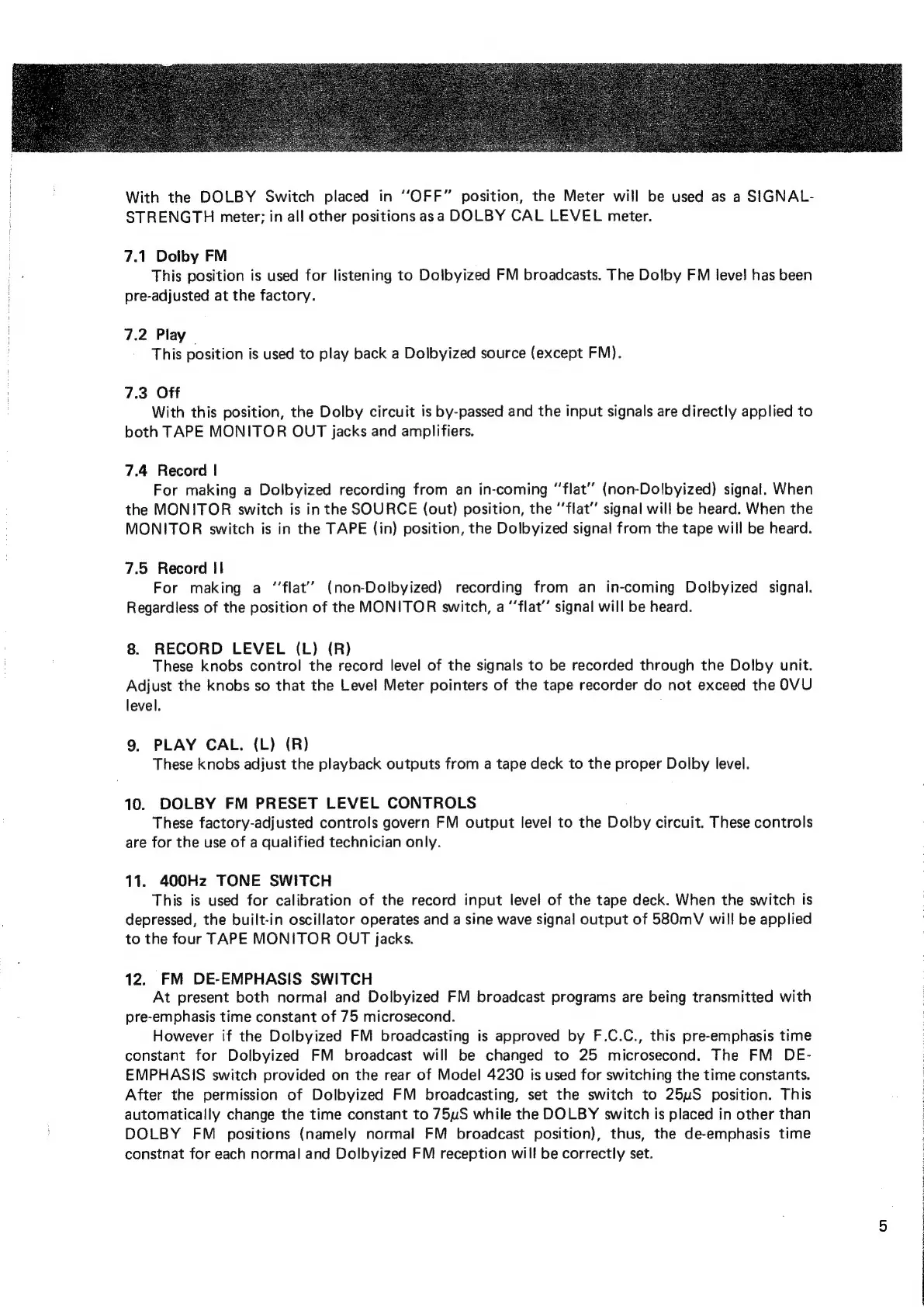 Marantz 4230 - Dolby FM Usage; Playback Usage; Record Modes; Off Position