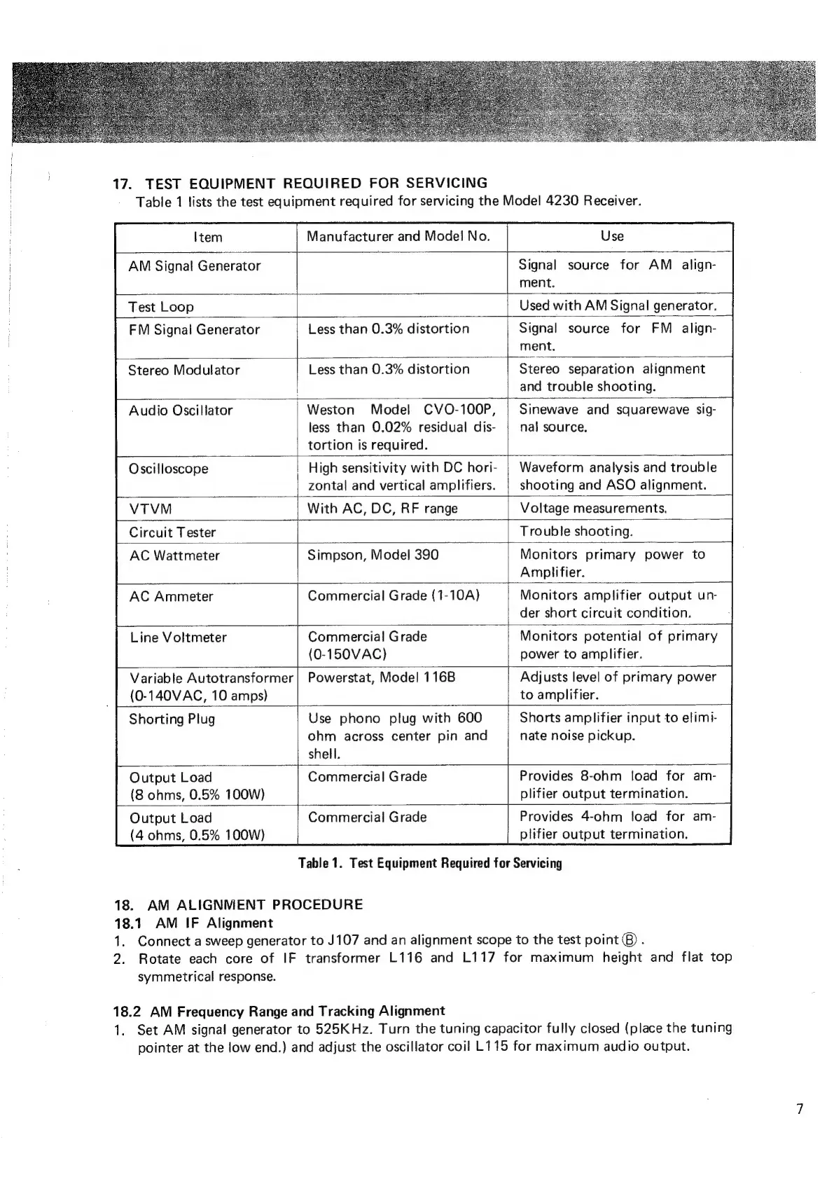 Marantz 4230 - Test Equipment Required for Servicing; AM Alignment Procedure; AM IF Alignment; AM Frequency Range and Tracking Alignment