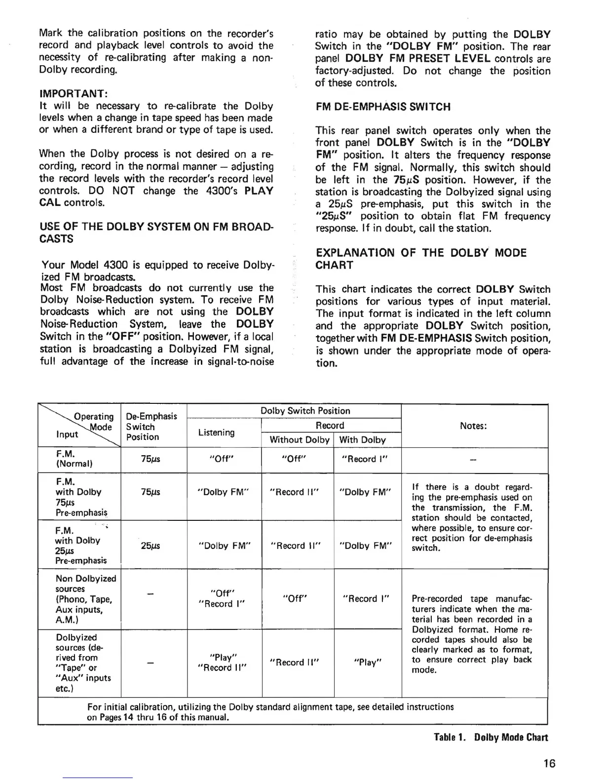 the appropriate DOLBY Switch position,