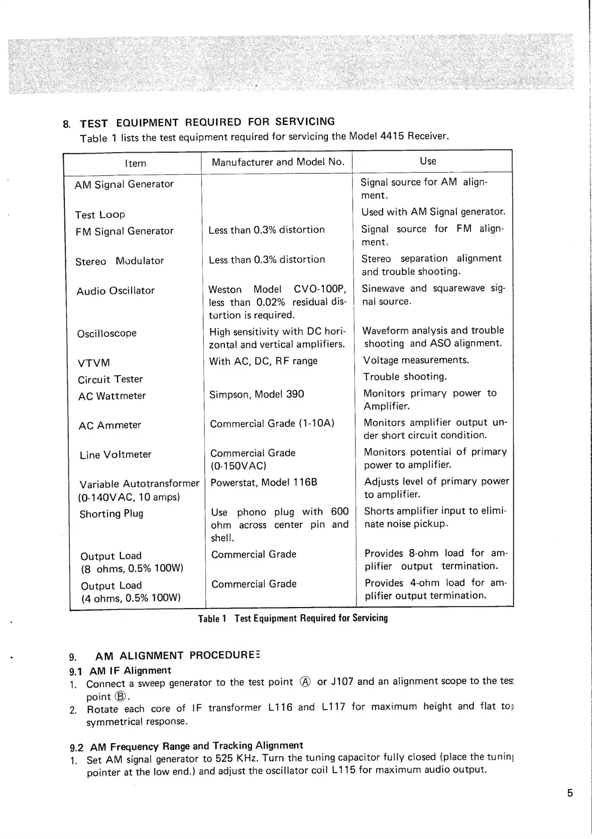 Marantz 4415 - SERVICING PROCEDURES; TEST EQUIPMENT REQUIRED FOR SERVICING; AM ALIGNMENT PROCEDURE