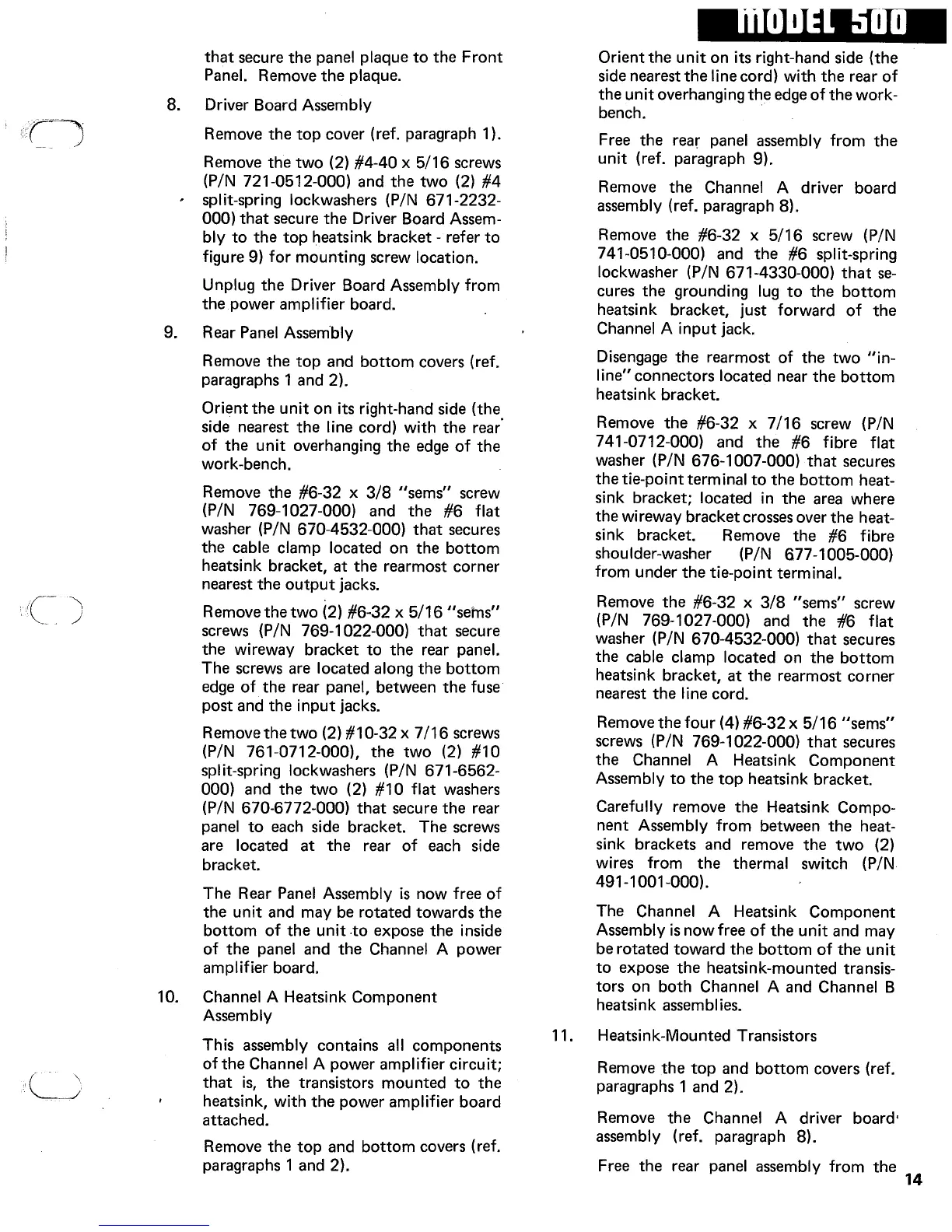 Marantz 500 - Service Notes - Disassembly (Internal Boards); Driver Board and Rear Panel Disassembly; Channel A Heatsink Assembly Disassembly