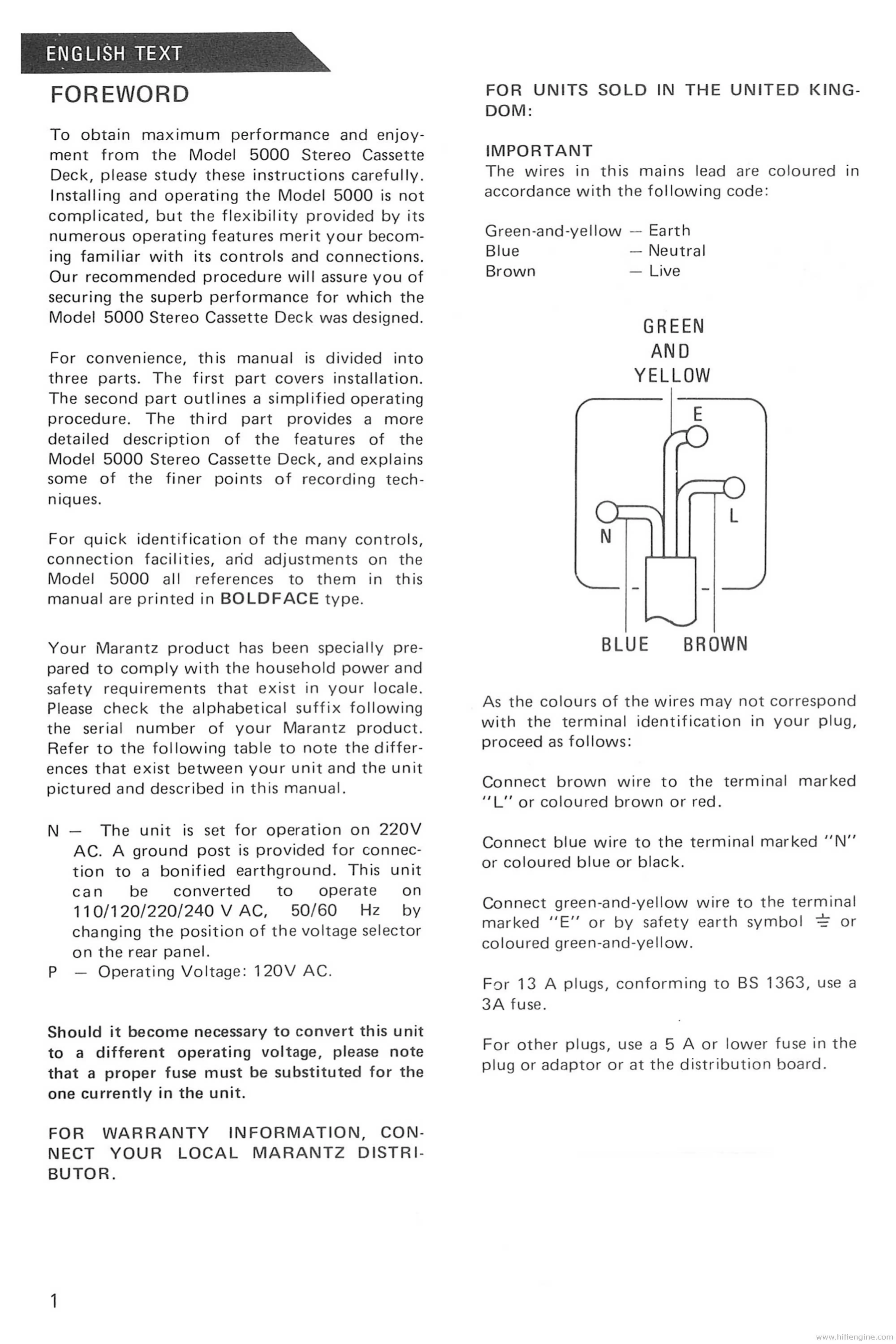 Marantz 5000 - FOREWORD; UK Mains Lead Wiring