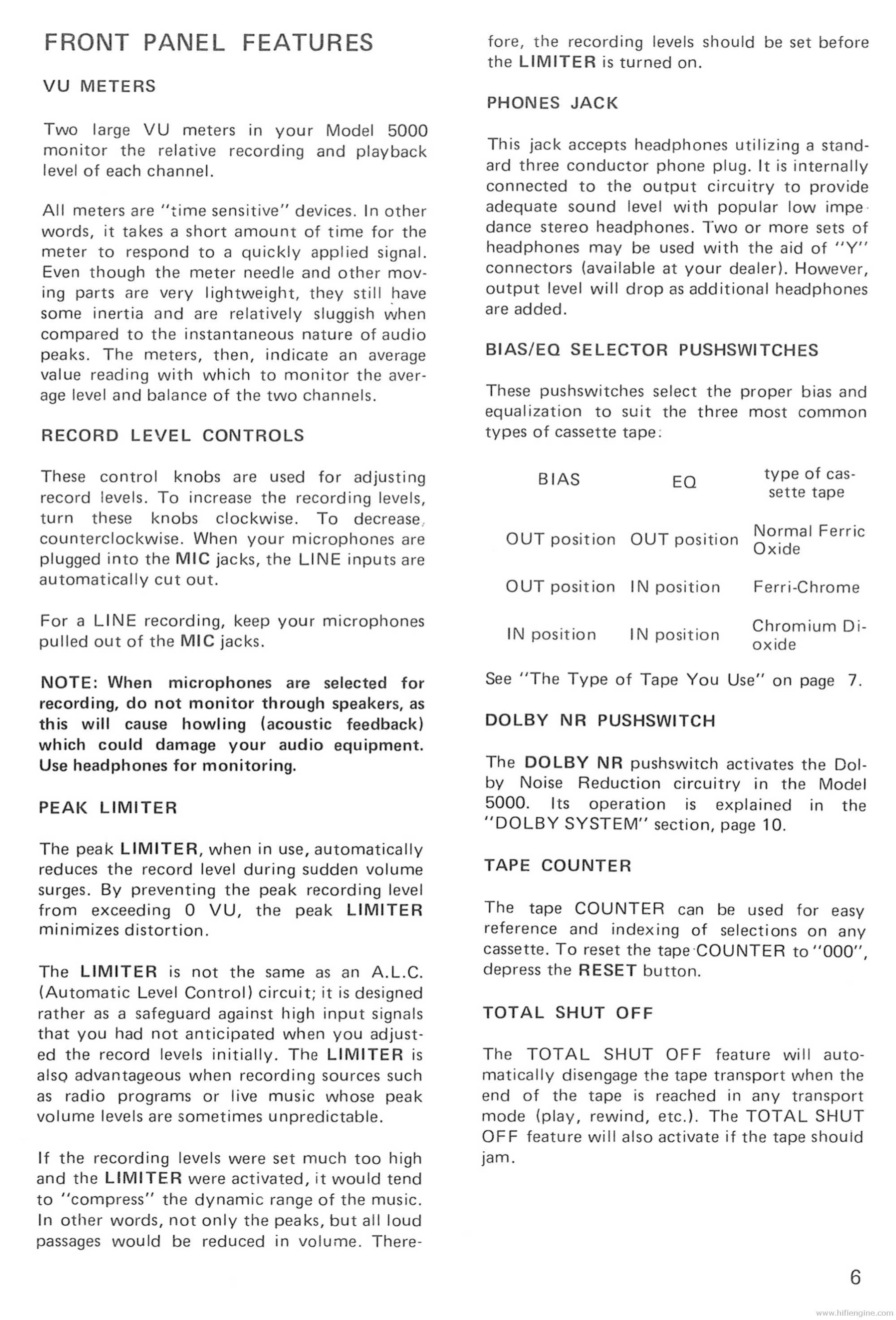 Marantz 5000 - FRONT PANEL FEATURES; VU Meters Description; Record Level Controls; Peak Limiter Function