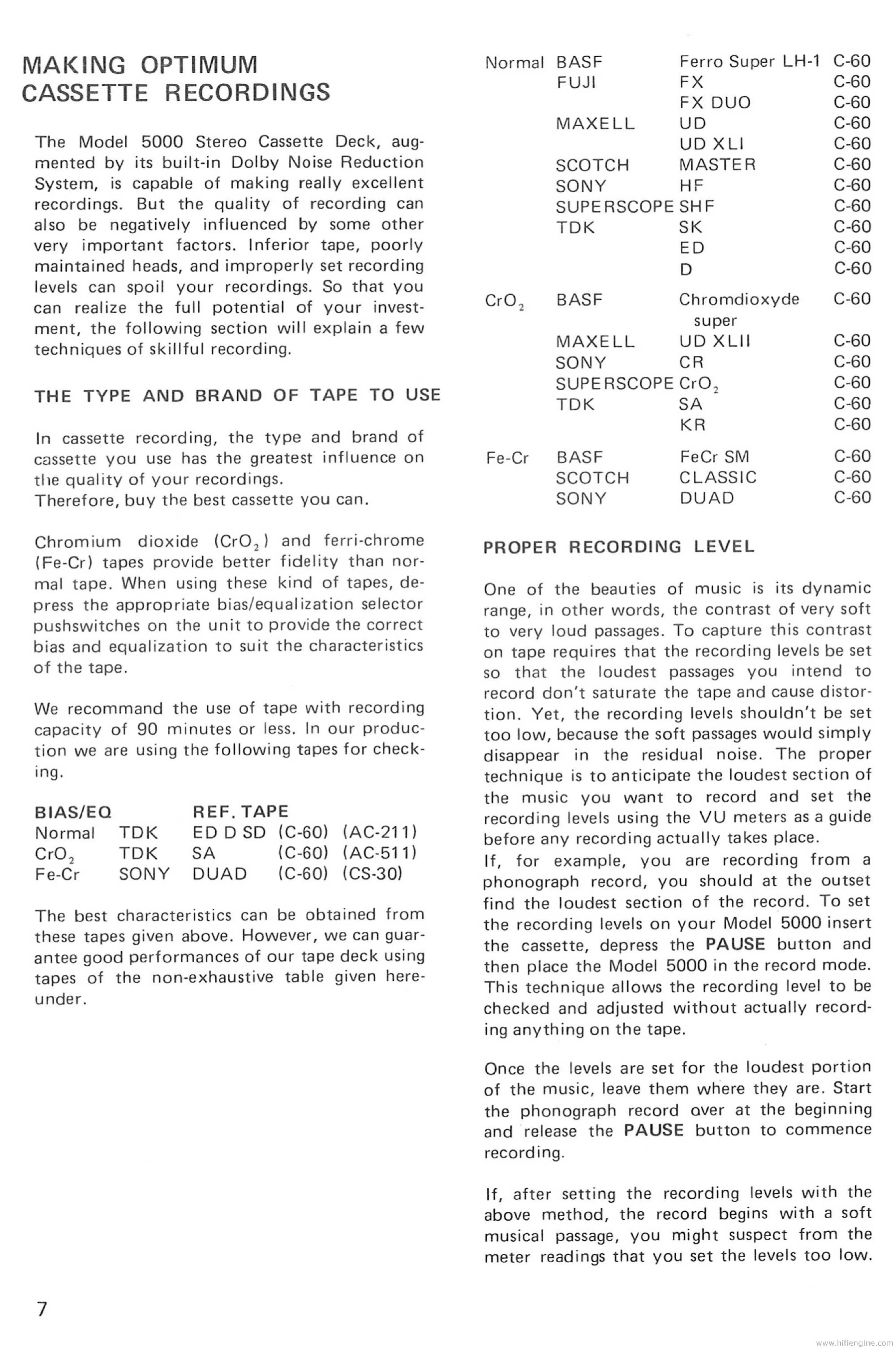 Marantz 5000 - MAKING OPTIMUM CASSETTE RECORDINGS; Selecting Cassette Tape; Setting Proper Recording Levels