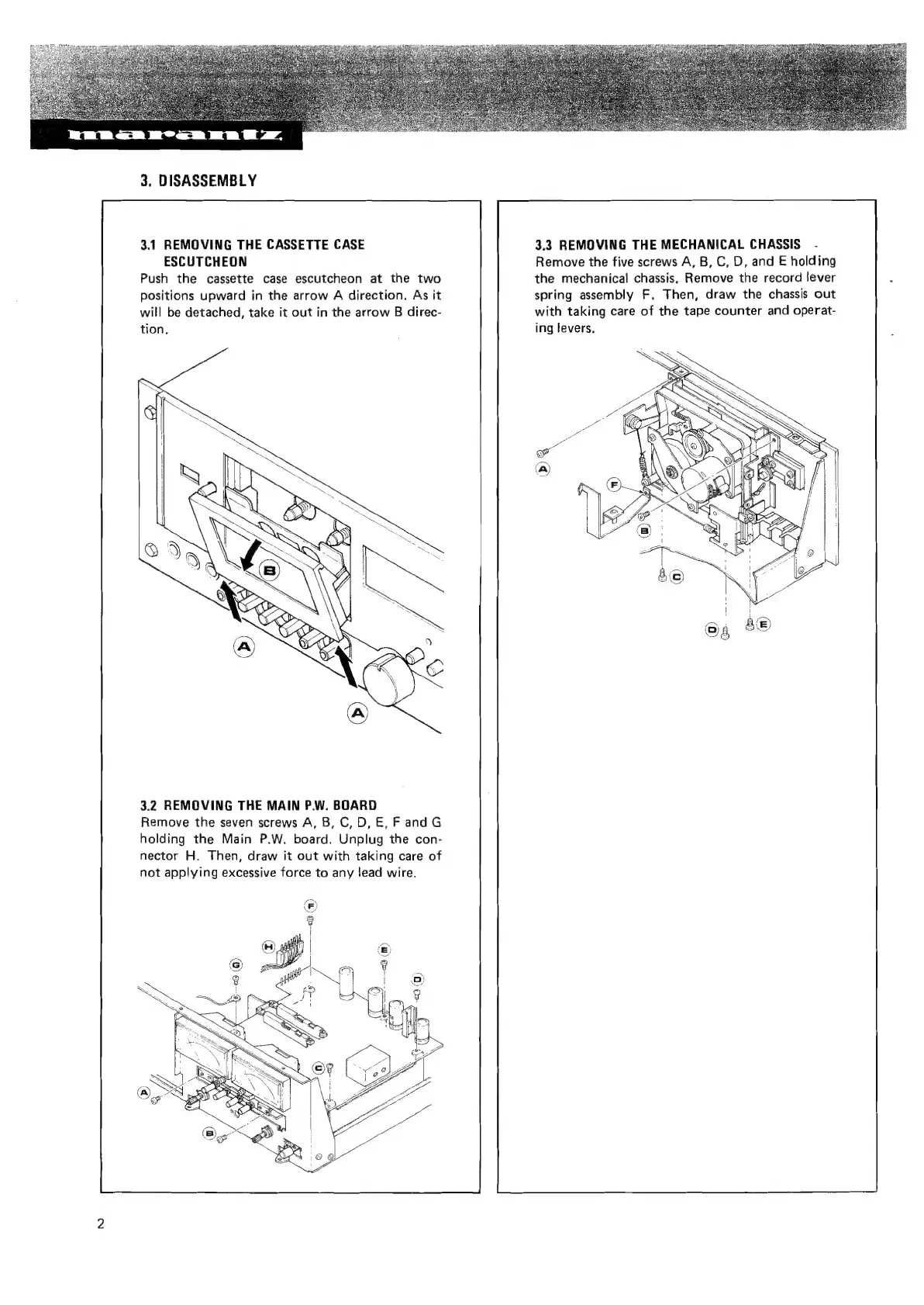 Marantz 5010 - 3. Disassembly Procedures; 3.1 Removing the Cassette Case Escutcheon; 3.2 Removing the Main P.W. Board; 3.3 Removing the Mechanical Chassis