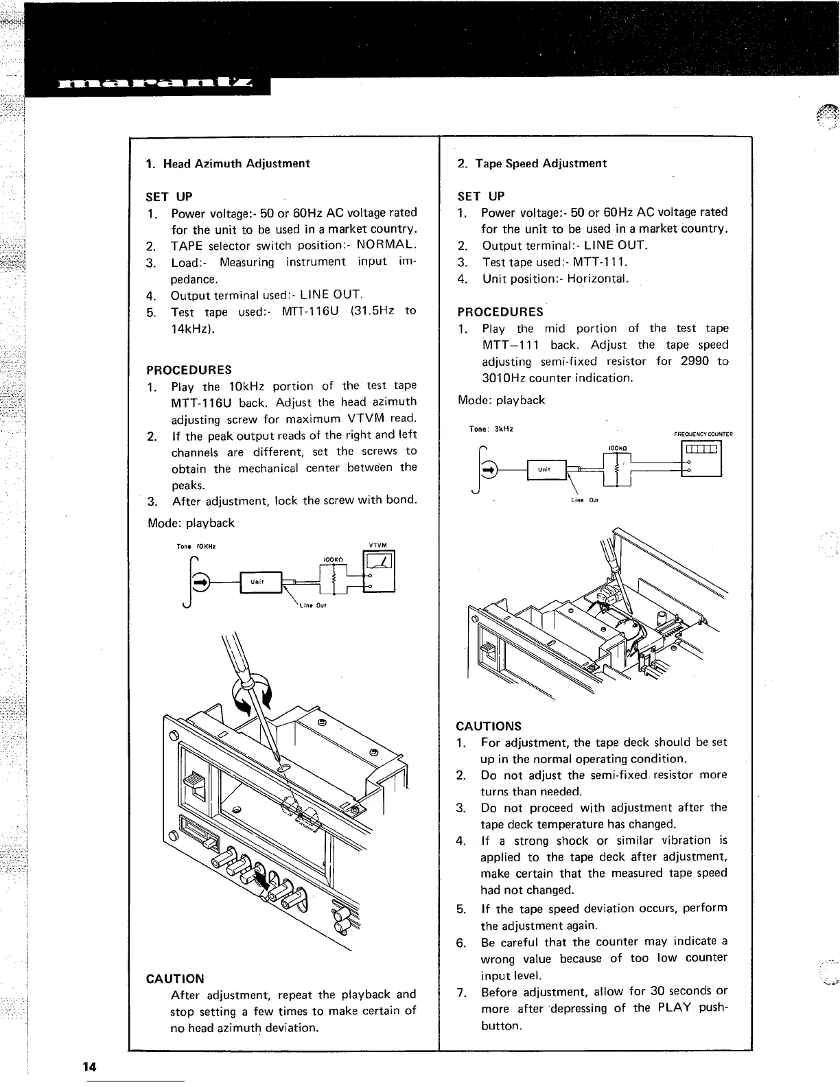 Marantz 5020 - Head and Tape Speed Adjustments; Head Azimuth Adjustment Setup & Procedure; Tape Speed Adjustment Setup & Procedure