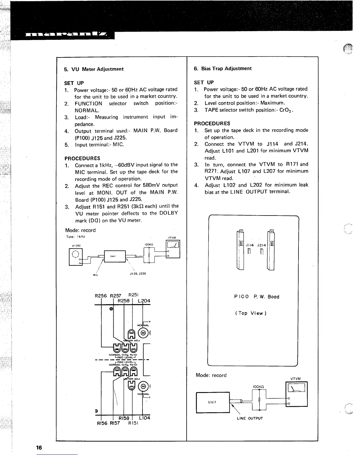 Marantz 5020 - Meter and Bias Trap Adjustments; VU Meter Adjustment Setup & Procedure; Bias Trap Adjustment Setup & Procedure