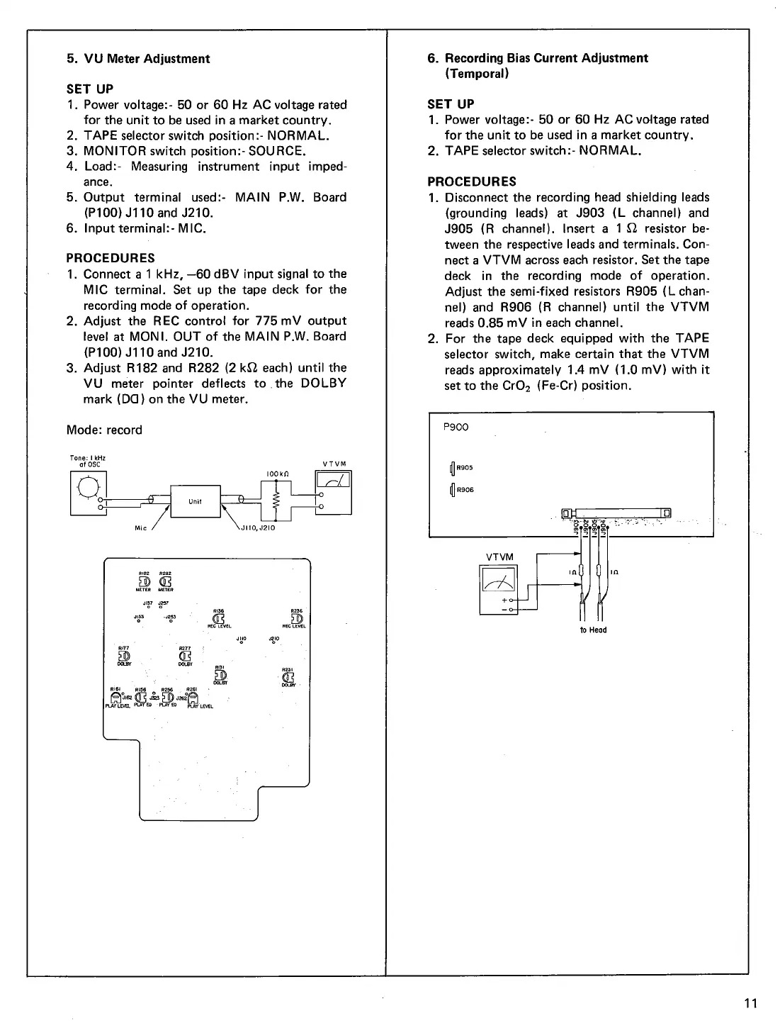 Marantz 5030 - VU Meter and Recording Bias Current Adjustments; VU Meter Setup and Procedures; Recording Bias Current Setup and Procedures