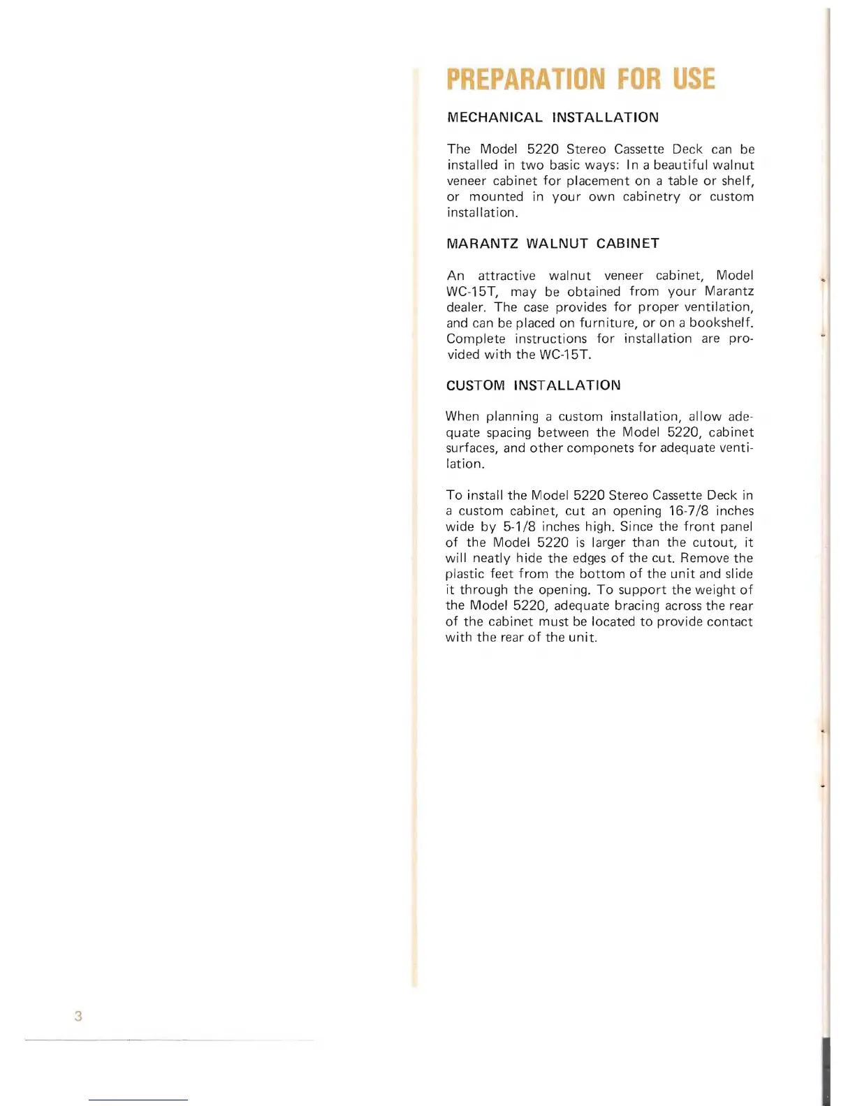 Marantz 5220 - PREPARATION FOR USE; MECHANICAL INSTALLATION; MARANTZ WALNUT CABINET; CUSTOM INSTALLATION