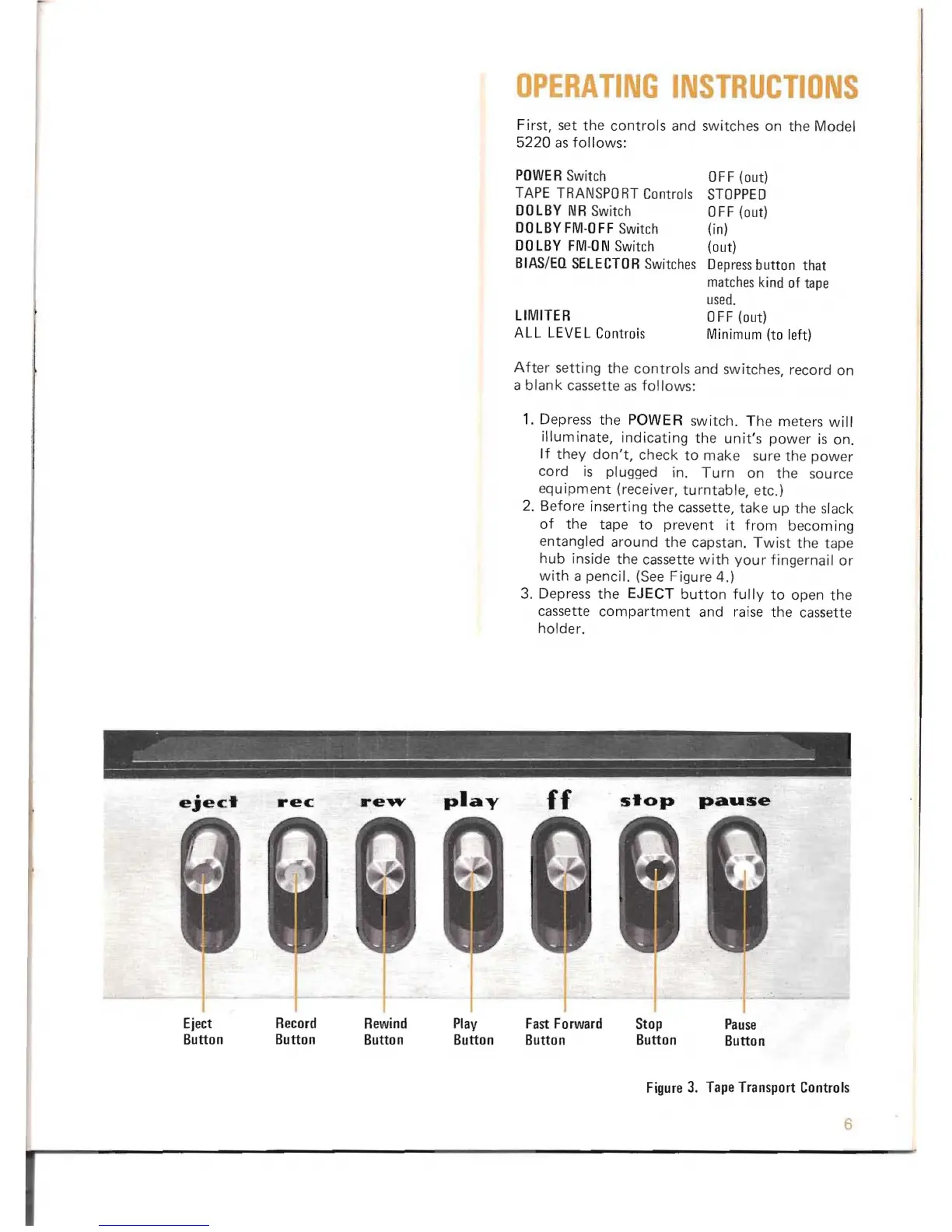 Marantz 5220 - OPERATING INSTRUCTIONS; Initial Control and Switch Settings; Cassette Insertion and Preparation