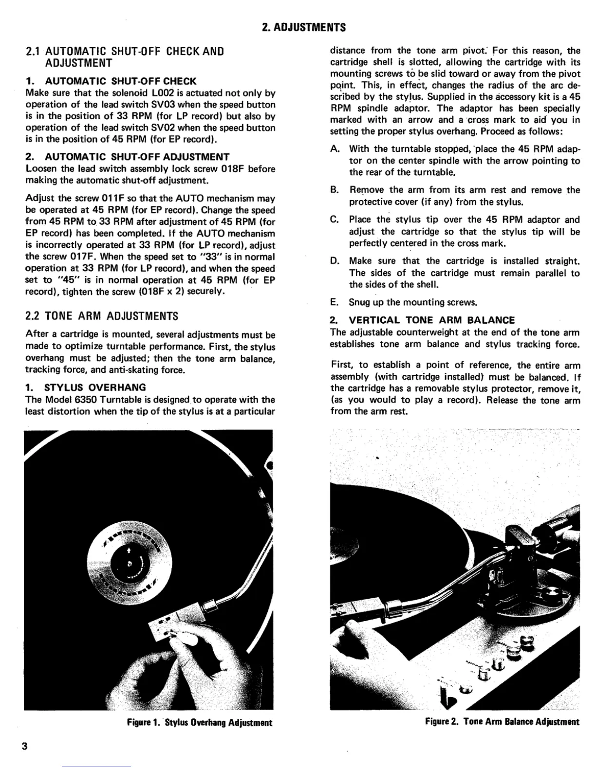 Marantz 6350 - Adjustments; Automatic Shut-Off Check and Adjustment; Tone Arm Adjustments Overview