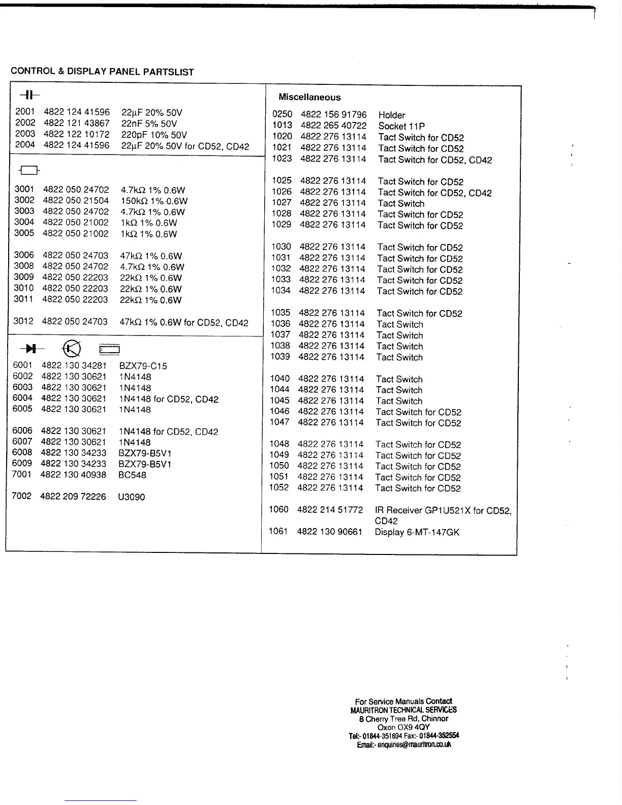 Marantz 74 CD-52/25B - Control & Display Panel Parts