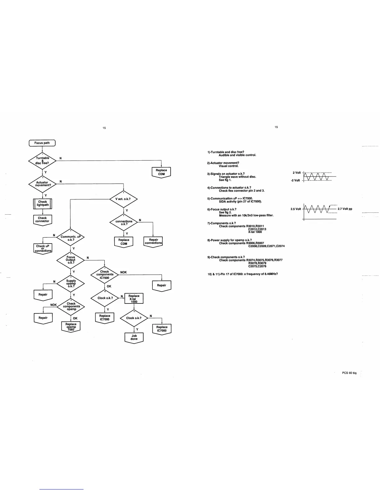 Marantz 74 CD38/o1B - Focus Path Troubleshooting; Turntable and Actuator Checks; Communication and Focus Output; Power Supply and Clock Checks