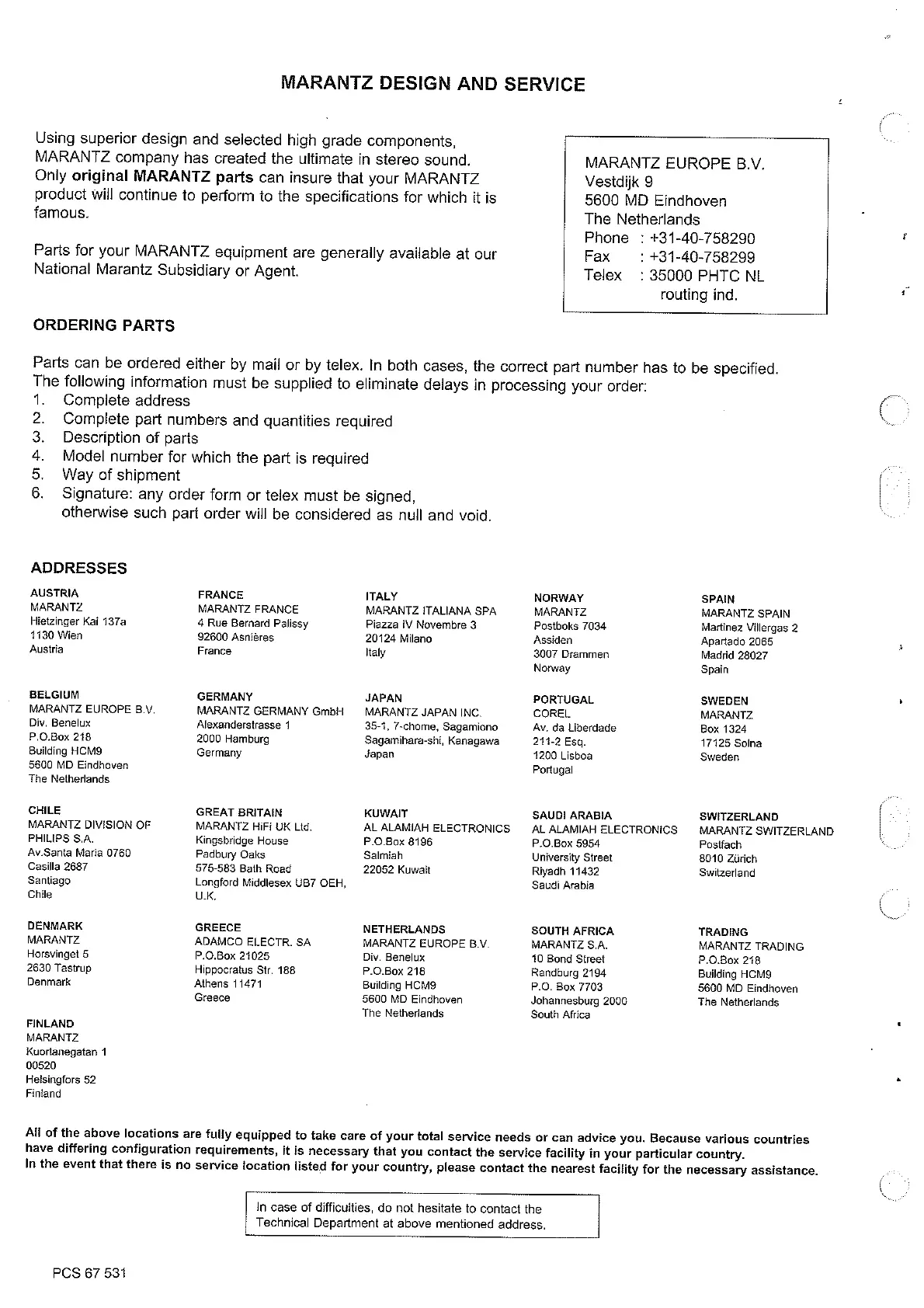 Marantz 74TT42 - Marantz Design and Service; Ordering Parts; Service Locations