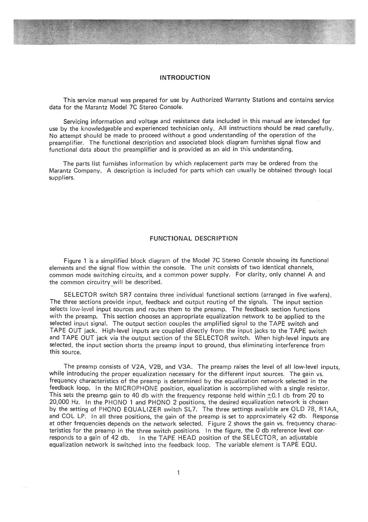 Marantz 7C Stereo Console - Introduction to Marantz Model 7 C Service Manual; Manual Purpose and Audience; Technical Information for Technicians; Functional Description of the Marantz 7 C Stereo Console