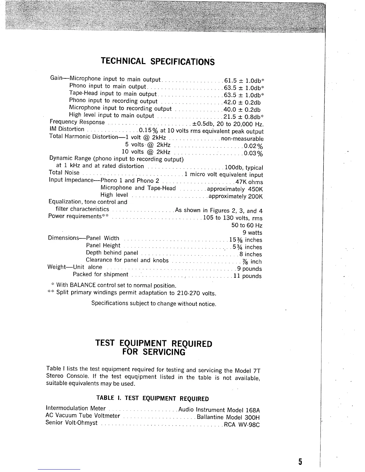 Marantz 7T - Technical Specifications; Test Equipment Required for Servicing